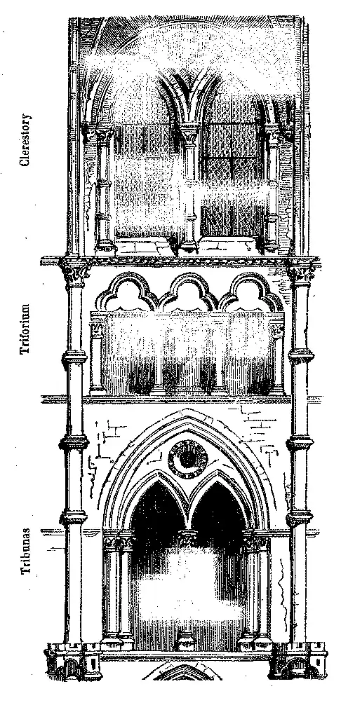 No interior dos edificios que apresentam tres andares sobrepostos, a parte média é constantemente occupada pelas tribunas, formando um andar com a mesma largura que a arcaria inferior das naves lateraes, ou formando simples galeria. Estas galerias compunham-se unicamente de uma continuação de arcadas sustentadas por columnasinhas; os antiquarios inglezes chamam-lhes triforium; e designam, pelo contrario, com a denominação de clerestory, a correnteza das janellas que está superior ao triforium, e que effectivamente dão luz á nave principal; gravura da pag. 175 [fig. 176].