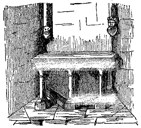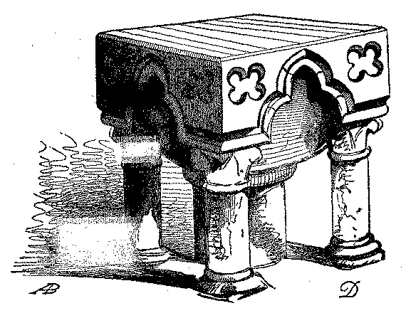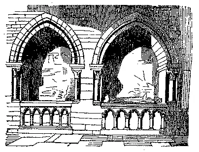 Os tumulos, mettidos nas paredes, como se vê na gravura junta, chamavam-se tumulos arqueados. A estatua do finado estava representada debaixo d'estas arcadas.[2]