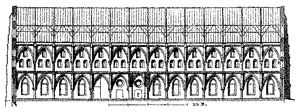 Porém, para exemplo de construcções civis e monasticas, não se póde apresentar outra mais importante, que a que pertence á abbadia de Vauclair, proximo de Laon; é uma das empenas, e uma das fachadas. Esta fachada não tem menos de 70 metros de comprimento; o edificio é dividido em numerosas e bellas salas, e compõe-se de dois andares abobadados, ficando por cima grandiosos celleiros, cujos madeiramentos são muito bem combinados.
