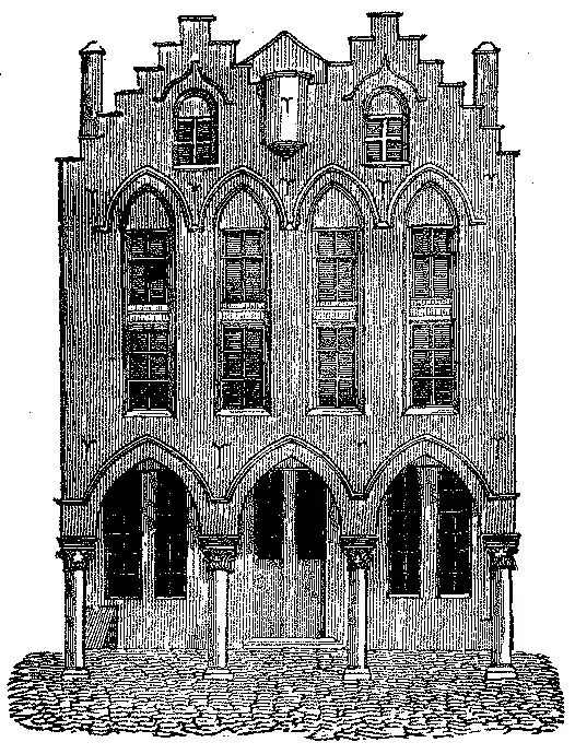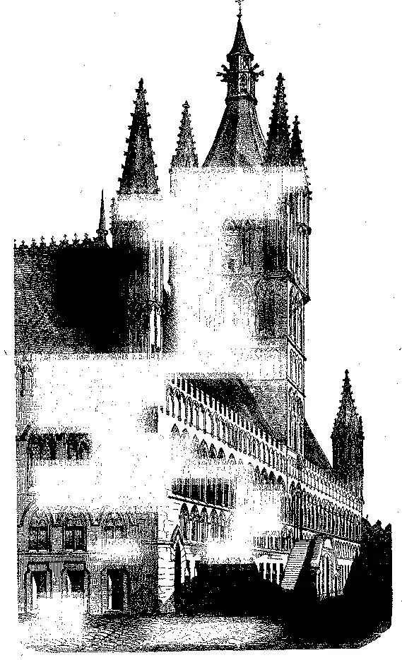 Pelos fins do seculo XIII as casas das Camaras comprehendiam egualmente mercados cobertos, os quaes vieram depois a ser edificios consideraveis nas cidades commerciaes, como está representado na gravura do edificio de Ypres, pag. 193 [fig. 195], posto que fosse concluida sómente em 1304, começando a construcção em 1200. É na verdade magnifico palacio.
