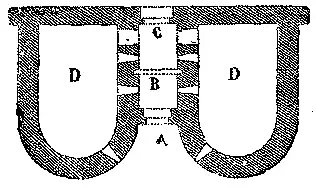 As grandes portas flanqueadas de duas torres, na entrada das praças fortes, tomaram tambem nas arcadas a fórma ogival; estando algumas vezes munidas de duas pontes levadiças; uma manobrando por detraz da ponte levadiça A, e a outra collocada na extremidade opposta da passagem de abobada, para o interior do recinto C. Habitualmente, não se podia communicar da porta com as duas torres lateraes: a entrada para ellas estava situada dentro do baylum, isto é, no primeiro recinto.