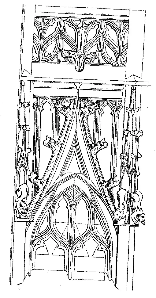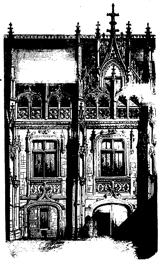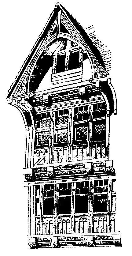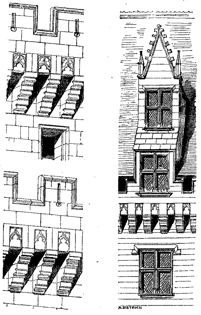As janellas abertas no madeiramento, ou trapeiras, eram coroadas por frontões pyramidaes extremamente delicados e por vezes acompanhados de contrafortes ou arcos butantes com recortes e pinaculos cheios de crochets e lavores. Este systema de ornamentação existiu durante a primeira metade do seculo XVI. Encontramos um bello especimen no palacio de justiça em Ruão.