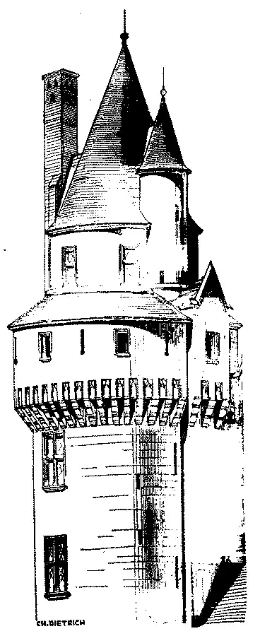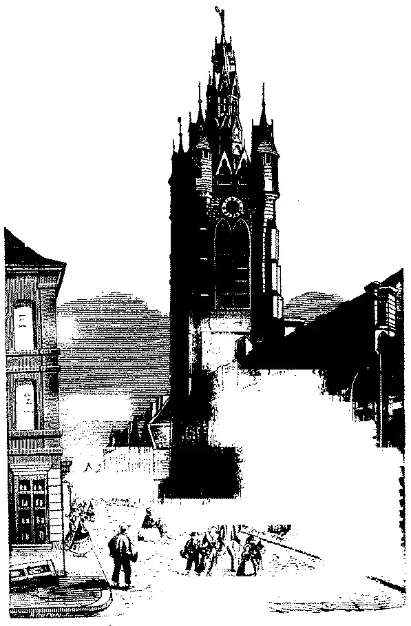O campanario que lhe pertencia, veio a ser então uma torre elegante e de extrema delicadeza, ornada de variados contornos, como as que se executavam nas igrejas. Muitas das cidades applicavam quantias avultadas para construir e ornar seu campanario, afim de que o vissem a grande distancia, e tambem para dar maior importancia á sua representação.