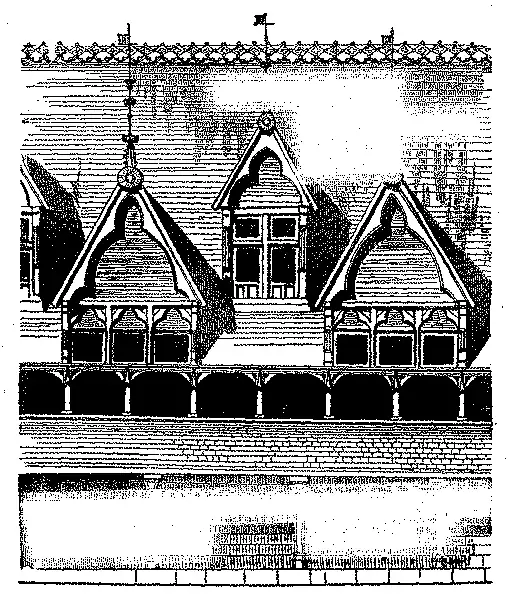 O telhado que cobre esta especie de attica, fica interrompido por grandes trapeiras symetricamente collocadas em duas ordens differentes, cuja disposição dá a esta parte do edificio a apparencia da decoração oriental. As empenas formadas de tres resaltos com duas, tres e até quatro aberturas, são compostas de madeiros reunidos de maneira engenhosa; d'estas especies de frontões recortados se levantam outros tantos grimpos formados por hasteas de ferro cobertas dos mais delicados ornamentos de chumbo. Sobre a fileira veste um delicado arrendado do mesmo metal.