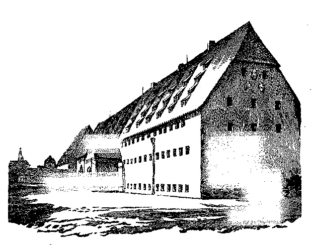 Os armazens e depositos continuam no seculo XV a apresentar construcções extraordinarias e com grande elevação. Citaremos para exemplo o de Nuremberg. A porta principal d'este vasto armazem é muito elegante; o tympano tem um escudo de armas e a data da construcção, 1498. O primeiro corpo d'este edificio, para o qual o portal dá saida para a rua, é o mais elevado; sendo dividido até ao telhado, em tres andares, e em quatro se comprehendermos os famosos subterraneos abobadados; depois apresenta seis andares ou galerias sobrepostas umas ás outras.