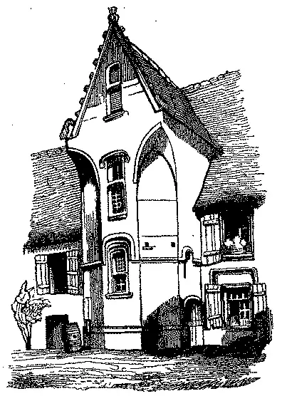 N'aquellas que ainda existem, os andares são bastante salientes, ficando em sacada uns sobre os outros, e as partes reentrantes, que apparecem no comprimento da edificação, são ornadas com molduras. Nas gravuras das paginas 266 [fig. 256] e 267 [fig. 257] vêem-se essas sacadas progressivas dos andares uns sobre os outros; nas cidades de grande população viam-se muitas vezes dois andares superiores ao rez-do-chão, e um terceiro andar posto ainda sobre o telhado, o qual recebia luz por grandes trapeiras. O maior numero das casas particulares tinha a empena voltada para o lado da rua; esta disposição era menos frequente nos palacios ou nas habitações das pessoas abastadas.