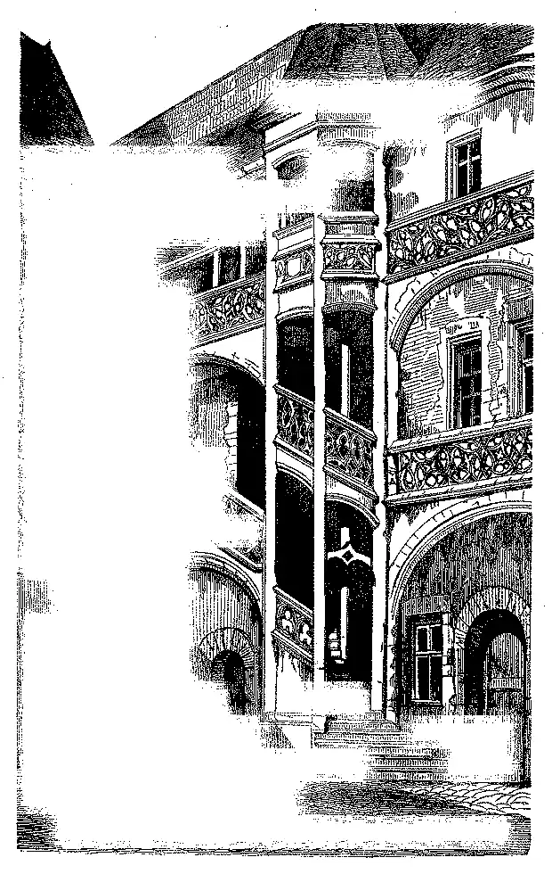 A outra casa é mais consideravel com pateo no interior, o qual mostra galerias e escadas com corrimões de pedra rendilhados, communicando com differentes andares, pag. 266 [fig. 256]. A disposição e a parte saliente d'essas galerias produzem n'essas construcções (como em muitas outras, em que o risco é quasi egual), o seu melhor e mais pittoresco efeito. Ás vezes tambem no plano terreo ha arcadas em roda dos palcos.