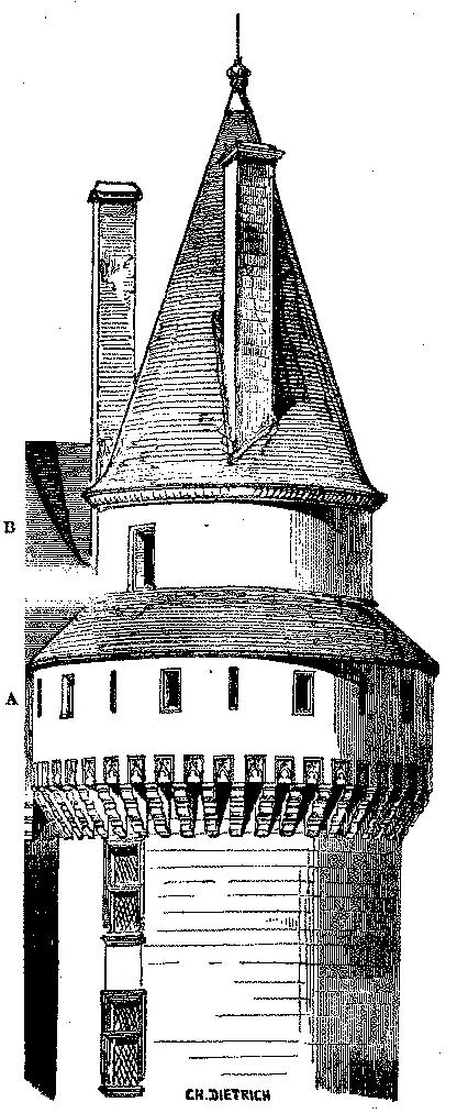 A parte cylindrica da torre eleva-se para formar um andar (B), por cima da galeria das besteiras (A), de maneira que a torre era dividida em duas partes em logar de ser coberta pelo mesmo telhado. Este systema, consistindo em estabelecer assim muitos andares de defeza pelas torres e tambem pelos muros entre os baluartes, fora adoptado desde o XIV seculo; porém mais geralmente empregado no XVI; posto que, em algumas partes, sejam vistos os dois systemas de construcções no mesmo castello.