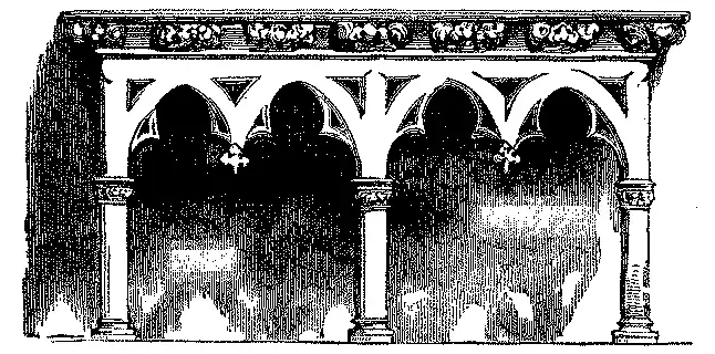 O altar, representado na gravura seguinte, tem 2m, 40 de comprido por 0m, 90 de fundo e 1m, 80 de altura. Sustentam-no tres pequenas columnas. A decoração na frente compõe-se de quatro curvaturas, alternadamente separadas por uma columna e por um pendural.