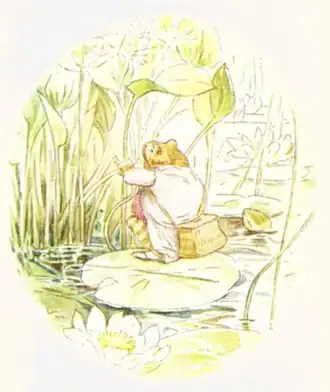 "Um peixinho! um peixinho! Eu o peguei pelo nariz!" - gritou o Sr. Jeremy Fisher, levantando a vara.