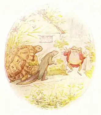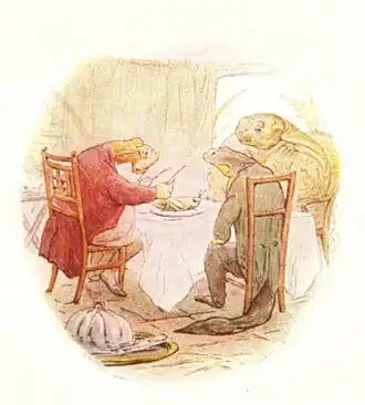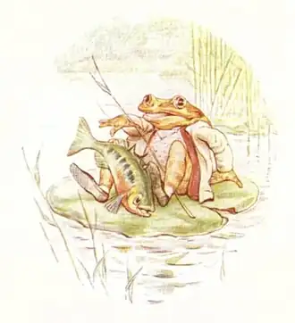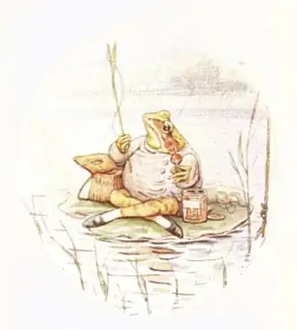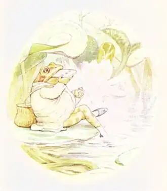 "EU VOU pegar algumas minhocas e ir pescar e pegar um prato de peixinhos para o meu jantar", disse o Sr. Jeremy Fisher. "Se eu pegar mais de cinco peixes, convidarei meus amigos Sr. Alderman Ptolemy Tortoise e Sir Isaac Newton. O vereador, porém, come salada."
