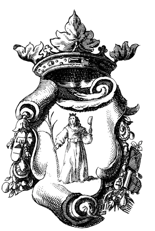 A capitania de Pernambuco tem uma donzella que admira a propria belleza em um espelho, symbolisando a formosura da terra e a situação em nome da sua capital Olinda, e tendo na mão direita uma canna de assucar (Fig 12).