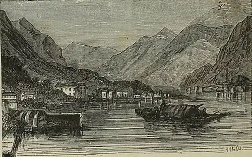O braço do lago de Como que se dirige para sul entre duas cadeias ininterruptas de montanhas, formando tantos pequenos golphos e enseadas quantas são as sinuosidades dessas mesmas montanhas, se estreita bruscamente e toma o curso e apparencia de um rio, entre um promontorio á direita e uma larga costa do outro lado. A ponte que neste lugar communica as duas margens, parece tornar mais sensivel á vista esta transformação e indicar o ponto onde o lago termina e o Adda recomeça, para em seguida novamente tomar o nome de lago para além, onde as bordas, outra vez afastadas, deixam a agua extender-se e moderar o seu curso em tantos outros golphos e enseadas. A costa, formada dos depositos de tres grossas torrentes, avança em rampa, apoiando a sua parte superior no pé de dois montes contiguos, um dos quaes traz o nome de San Martino e o outro, em dialecto lombardo, Il Resegone [1], por causa de seus numerosas dentes que o tornam com effeito semelhante a uma serra; de modo que não ha pessoa que, vendo-o de face, como por exemplo dos muros de Milão, voltada para a norte, não o distinga logo, só por esse indicio, na longa e vasta cadeia de montanhas de nome menos conhecido e de forma mais ordinaria, por entre as quaes se mostra. Durante muito tempo a costa se eleva em uma rampa suave e continua; depois rasga-se em prados e em pequenos valles, em eminencias e em baixos, conforme a estructura das duas montanhas e a acção das aguas que