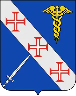 BRAZÃO DE ARMAS: Em campo azul. uma banda de prata carregada de trez cruzes da ordem de Christo. de góles, vasia do campo, entre um caduceu de oiro á sinistra, e uma espada de prata á destra.