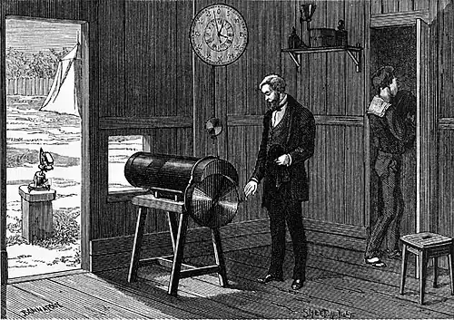 No disco C há doze aberturas ou janelas igualmente espaçadas F (figs. 1 e 3). Este disco completa sua revolução completa em dezoito segundos, enquanto a roda de placa daguerrianna P, embora também receba seu movimento circular do relógio, gira quatro vezes mais devagar, ou seja, completa sua revolução completa em setenta e dois segundos.