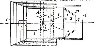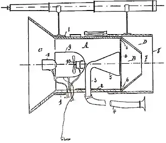 ![]() Fig. 2. Plano em secção axial sendo o apparelho provido de uma caixa cartonada. Os traços muitos indicão a caixa C recolhida . ![]() Escala - Rio de Janeiro, 9 de março de 1901. Como procuradores: Jules Geraud, Leclerc & Ciª |