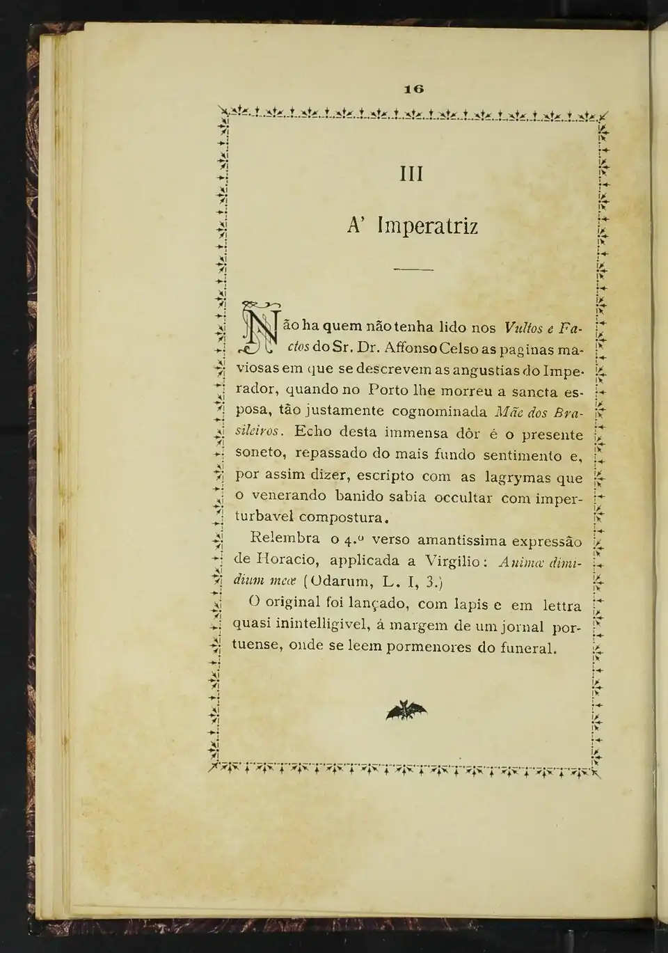 Não ha quem não tenha lido nos Vultos e Factos do Sr. Dr. Affonso Celso as paginas maviosas em que se descrevem as angustias do Imperador, quando no Porto lhe morreu a sancta esposa, tão justamente cognominada Mãe dos Brasileiros. Echo desta immensa dôr é o presente