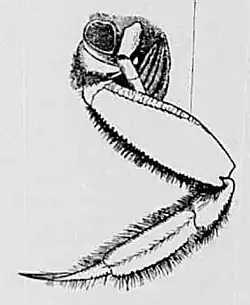 Afim de completar este arranjo os maxillipedes externos, como na verdade já é sabido de ha muito, supportam uma carena proeminente, provida de uma densa franja de cabellos, a qual começa na frente, proximo á linha mediana e passa para traz e para fóra, seguindo até o angulo externo da armação oral. Assim, as duas rugas da direita e da esquerda formam, juntas, um triangulo com o vertice virado para frente, — um quebra mar pelo qual a agua fluente da cavidade branchial é affastada da bocca e, reconduzida áquella cavidade.