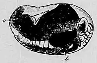 Os Amphipodes são differenciados dos Isopodes, em um periodo primitivo do ovo, pela posição differente do embryão, cuja extremidade posterior é curva para baixo (fig. 43). Em todos os animaes d'esta ordem, para tal fim, [2] apparece muito cedo uma estructura peculiar na parte anterior do dorso, pela qual o embryão é ligado á membrana ovular interna e que foi chamado «apparelho micropylar», porém, impropriamente, segundo me parece. [3] Elle nos lembrará a união dos jovens Isopodes com a membrana larvar e o «orgão adherente», impar, da nuca dos Cladoceros, notavelmente desenvolvido em Evadne e persistente por toda a vida do animal; porém em Daphnia pulex, segundo Leydig, comquanto presente nos jovens, desapparece sem deixar traço algum nos adultos.