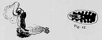 No macho, anão, os olhos, as antennas e as patas são, na regra, melhor preservados que na femea; porém, por outro lado, todos os appendices do abdomen, frequentemente não desapparecem e, ás vezes, os traços de segmentação. Nas femeas de Entoniscus que são encontradas na cavidade somatica dos caranqueijos e Porcellanae, os olhos, as antennas e orgãos oraes, a segmentação do corpo vermiforme, e em uma especie (figs. 41 e 42) o total dos membros, desapparecem quasi sem deixar traço algum; e Cryptoniscus planarioides, mais depressa seria encarado um Plathelmintho do que um Isopode, se seus ovos e filhotes não trahissem sua natureza de crustaceo. Entre os machos d'estes varios Bopyrideos, o de Entoniscus porcellanae occupa o mais baixo logar; em toda a sua vida, cabem-lhe seis pares de patas, reduzidas á disformes cotos arredondados.