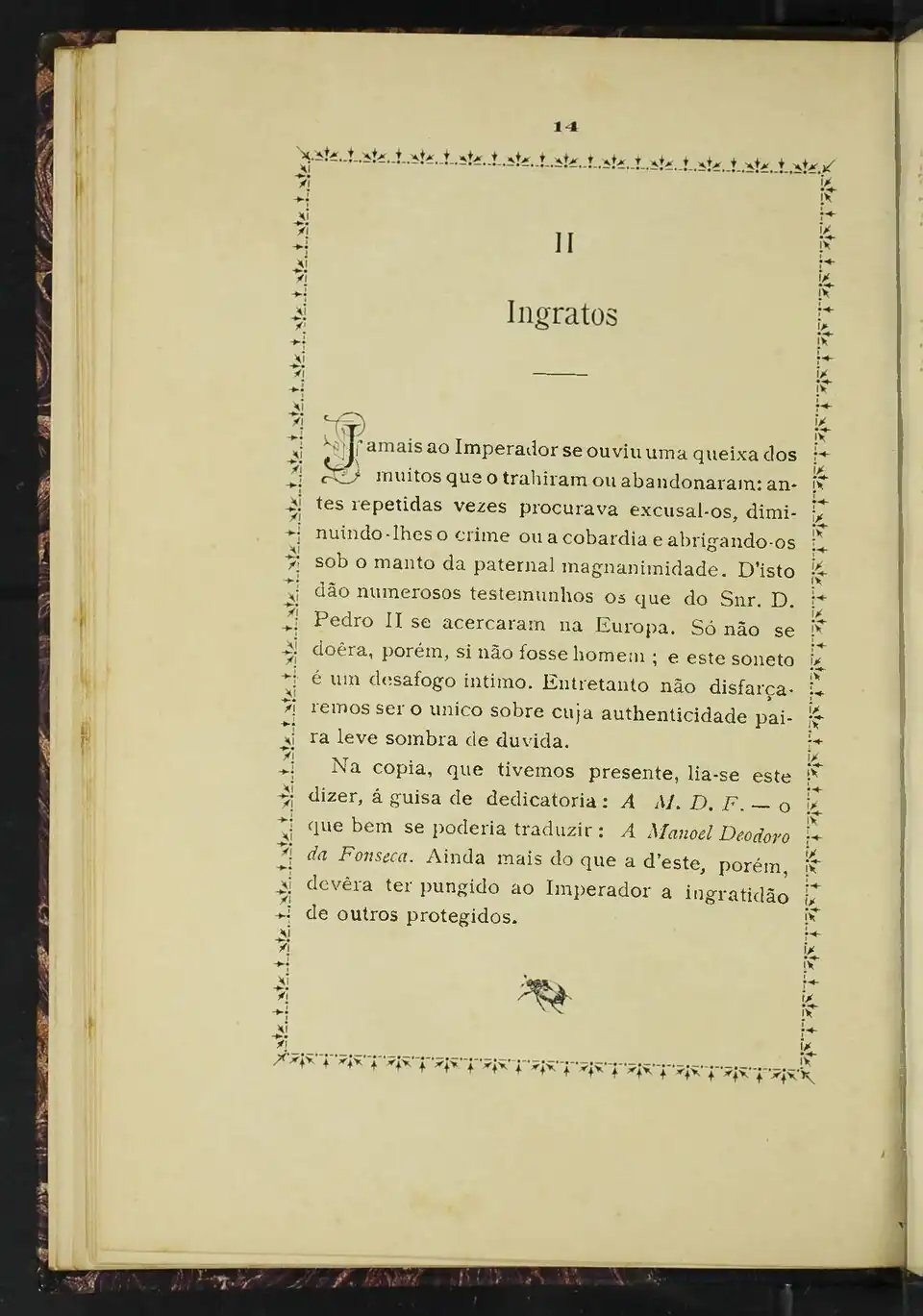 Na copia, que tivemos presente, lia-se este dizer, á guisa de dedicatoria: A M. D. F.— o que bem se poderia traduzir: A Manoel Deodoro da Fonseca. Ainda mais do que a d’este, porém, devera ter pungido ao Imperador a ingratidão de outros protegidos.