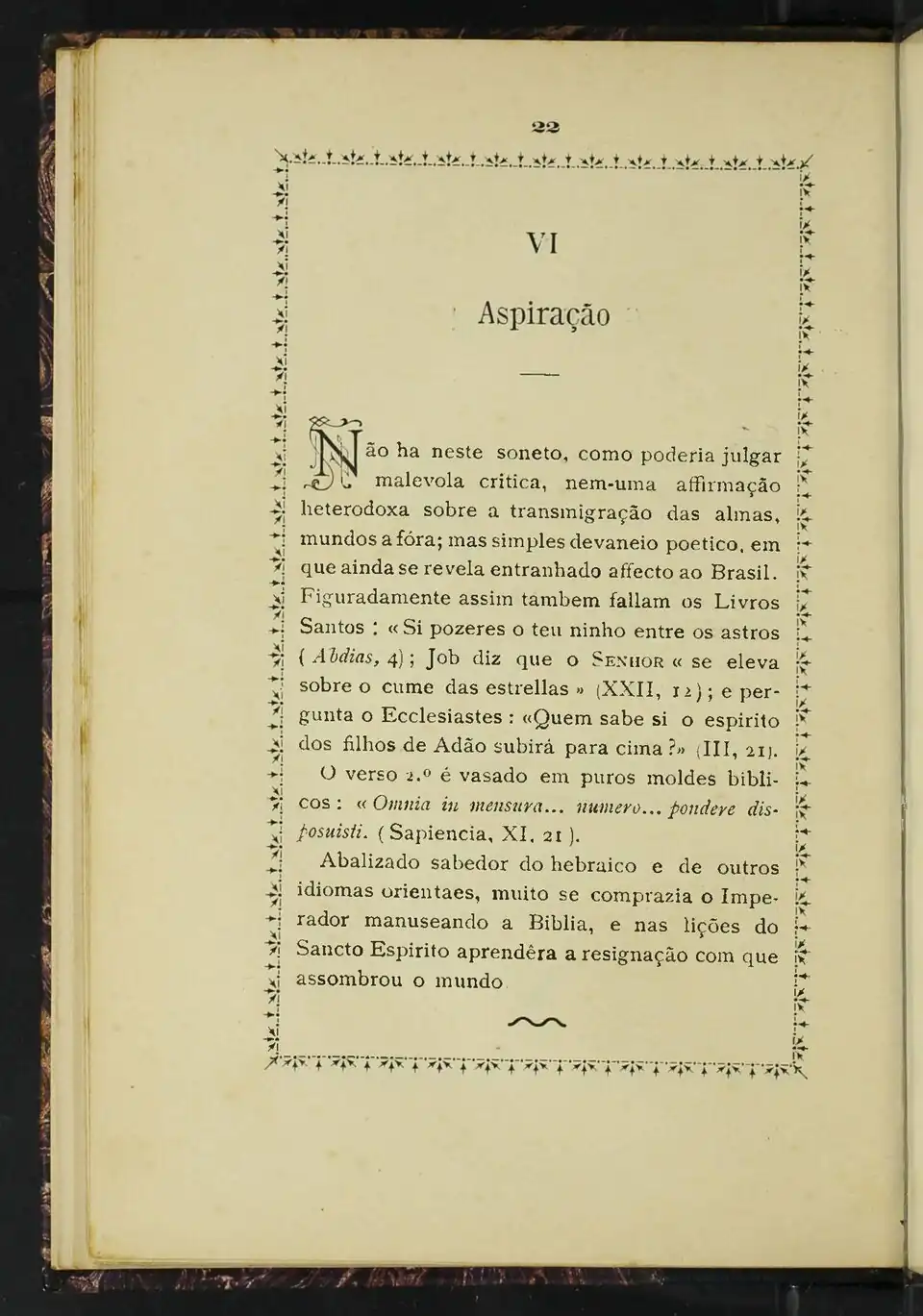 Abalizado sabedor do hebraico e de outros idiomas orientaes, muito se comprazia o Imperador manuseando a Biblia, e nas lições do Sancto Espirito aprendêra a resignação com que assombrou o mundo