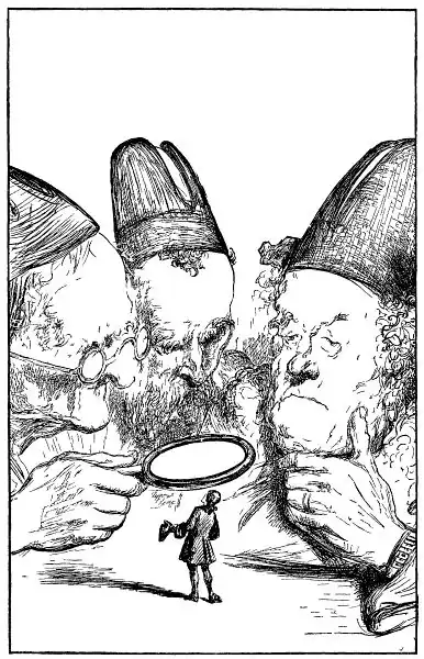 Sua majestade mandou chamar três grandes sábios, que estavam então em sua tarefa semanal, de acordo com o costume daquele país. Estes cavalheiros, depois de terem examinado a minha figura com a maior delicadeza, tiveram diferentes concepções a meu respeito. Todos concordaram que eu não poderia ser produzido de acordo com as leis regulares da natureza, porque eu não fora moldado com a capacidade de preservar a minha vida, ou por causa da agilidade, ou subindo em árvores, ou cavando buracos na terra.