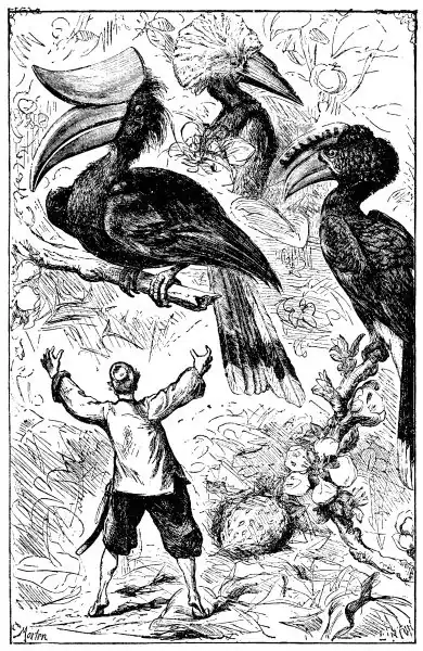 Não sei o que era maior se o meu prazer ou o meu terror em observar, naqueles passeios solitários, que os pássaros menores pareciam não ter nenhum medo de mim, mas saltitavam perto de mim a uma distância de um metro, procurando vermes e outros alimentos, com tanta indiferença e segurança como se não houvesse nenhuma criatura perto deles. Lembro-me quando um tordo teve a confiança de arrancar de minha mão, com seu bico, um pedaço de bolo que Glumdalclitch tinha me dado para meu café da manhã.