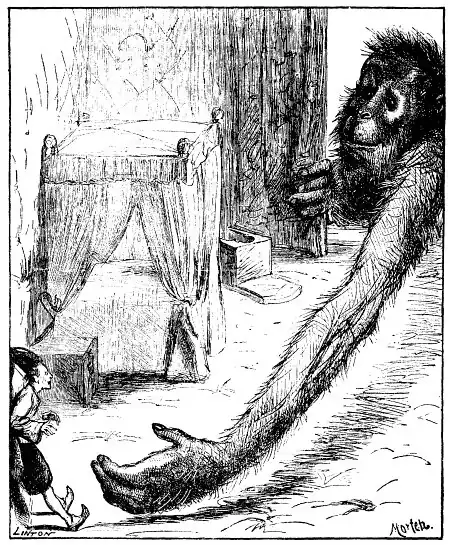Tenho fortes razões para acreditar que ele me pegou como se eu fosse uma das crias de sua espécie, porque ele costumava tocar gentilmente o meu rosto com sua outra pata. Estava ele se divertindo quando foi interrompido por um ruído na porta do gabinete, como se alguém a estivesse abrindo: então ele rapidamente saltou em direção à janela por onde havia entrado, e então seguindo por trilhas e sarjetas, caminhando sobre três patas, e me segurando com a quarta, até que ele subiu um telhado que estava próximo de nós.