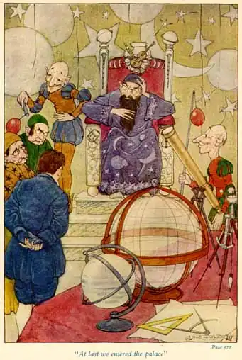 Enfim, entramos no palácio, e seguimos até a sala de audiência, onde vi o rei sentado em seu trono, acompanhado de ambos os lados por pessoas de alta linhagem. Diante do trono, havia uma mesa enorme repleta de globos e esferas, e instrumentos matemáticos de todos os tipos. O rei não teve a mínima percepção de nossa presença, embora a nossa entrada não tivesse ocorrido sem algum barulho, devido ao concurso de pessoas que faziam parte na corte.