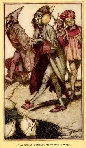 Mas eu não aprovei esta derivação, que me pareceu um pouco forçada. Arrisquei-me a oferecer, aos eruditos daquele povo, uma teoria criada por mim mesmo, de que LAPUTA era QUASI LAP OUTED; LAP significando na verdade a dança dos raios solares no mar, e OUTED, asa, suposição essa entretanto que não gostaria de impor, mas de submeter ao judicioso leitor.