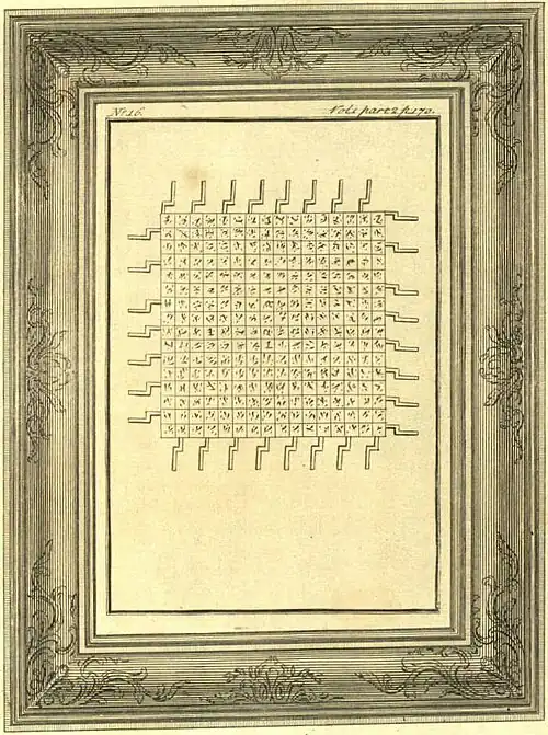 Esta operação foi repetida três ou quatro vezes, e em cada volta, o mecanismo era tão bem planejado, que as palavras se moviam para novos lugares, a medida que os pedaços de madeira quadrados se movimentavam de cima para baixo.