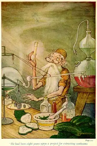 A primeira pessoa que conheci foi um homem de aspecto magro, com a cara e as mãos sujas de fuligem, usava cabelos e barbas longas, todo maltrapilho, e chamuscado em várias partes. Suas roupas, a camisa e a pele eram todos da mesma cor. Há oito anos que ele estava debruçado em cima de um projeto para extração de raios de sol a partir de pepinos, que deviam ser colocados em frascos de vidros hermeticamente fechados, e deixados aquecer ao ar livre nos verões inclementes e de forma natural.