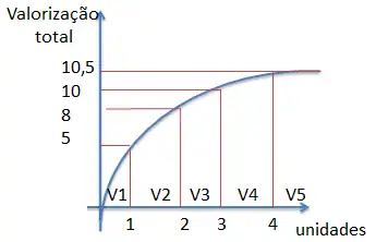 Como o Sr. Silva está cheio de fome, valoriza o consumo do bolo em 5€. Em relação ao consumo de um segundo bolo valoriza-o em 3€ (pois continua com fome). Continuando este raciocínio chegamos ao ponto em que valoriza o consumo de um terceiro bolo em apenas 2€, o quarto em 0,5€ e os seguintes em 0€ (pois mesmo que lhe fossem oferecidos o Sr. Silva não consumiria os bolos pois já estava satisfeito). Esta lógica reflecte a valorização total que o sr. Silva faz do bem e que é representada pelo gráfico seguinte.