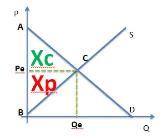 Este valor é o excedente do consumidor. E é representado graficamente pela área triangular que se encontra por cima do preço de equilíbrio e em baixo da procura. Esse triângulo (Xc), representa a satisfação que o consumidor obteve com a compra.