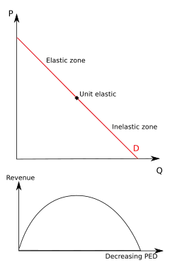 A imagem de cima permite-nos ocncluir que existem diferentes elasticidades nos diferentes pontos da curva. Se considerarmos um ponto A e um ponto B ambos na partte superior da curva concluímos que a passagem de A para B diminui o preço contudo, o aumento da quantidade é tal que a receita sobe! Da mesma forma se considerarmos um ponto C e um ponto D na parte inferior da curva, a passagem de C para D vai conduzir também a uma diminuição do preço. Contudo o aumento da quantidade não é suficiente para o compensar pelo que a receita diminui.