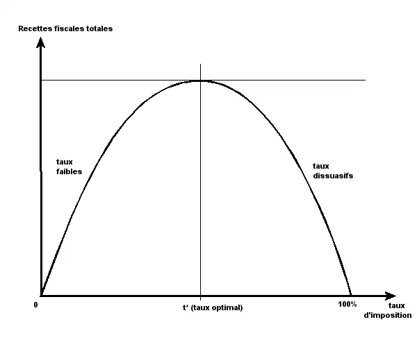 A curva de laffer representada pelo gráfico de baixo mostra que existem duas taxas possíveis para uma mesma receita. Se a taxa for pequena vai incidir sobre muitas empresas e dar determinada receita. Contudo se a taxa for muito elevada muitas empresas vão sair do mercado. Desta forma apesar da taxa ser elevada, a receita pode não ser maior do que era anteriormente. Assim, existe uma taxa máxima que permite maximizar a receita do estado. A partir dessa taxa a receita começa a diminuir pois a destruição de acitividade económica é tal que apesar do aumento da taxa a receita cai. Em caso de dúvida entre uma taxa pequena e uma maior que originem a mesma receita, a taxa menor é obviamente preferível pois resulta numa menor deadweight loss (a ineficiência é menor quanto menor a taxa).