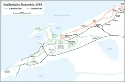 A rede de eléctricos de Alexandria é uma rede extensa construída em 1860, e é por sua vez, a mais velha rede de eléctricos da África. A rede está dividida em duas partes que se encontram/juntam na "Estação de Raml". Os eléctricos que operam a esta da "Estação de Raml" estão pintados de azul e são conhecidos geralmente como "Eléctricos de al-Raml". Por sua vez, os eléctricos que operam para oeste da Estação de Raml, estão pintados de amarelo e são um pouco mais pequenos que os outros, com apenas um veículo a trabalhar em ambas as direcções.