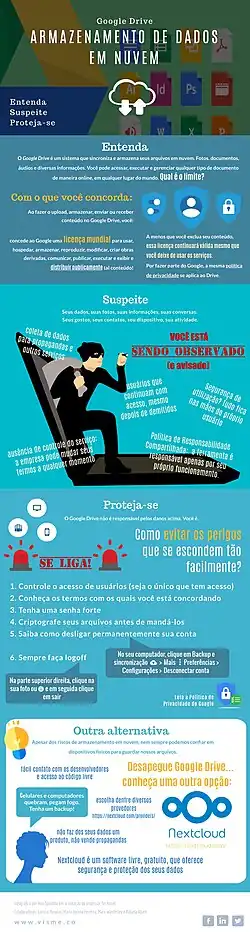 Existem diversos aplicativos para armazenamento de dados e arquivos, mas um se destaca como uma boa alternativa ao Google Drive, o aplicativo NextCloud[2]. Esse aplicativo e serviço apresenta diversos benefícios, é uma fonte aberta, gratuita, que oferece proteção de dados, a privacidade e uma forma prática e fácil de uso, para todos, onde os usuários tem controle total de seus arquivos.