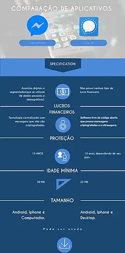 O Signal possui software livre e é um serviço de mensagens criptografadas, que é caracterizado como ultra-seguro para Iphone e Android pelo site Techtudo.[6] É utilizado de forma rápida, simples e segura, podendo ser por via Android, Iphone ou Desktop. Tem funções de enviar textos, áudios, vídeos, documentos e imagens para qualquer lugar do mundo, sem tarifas, ele é totalmente gratuito. Além dessas funções, o Signal disponibiliza o mecanismo de programar mensagens para desaparecer. A idade mínima para utilizar o aplicativo é de 13 anos, porém, a idade mínima para usar os serviços da Signal sem autorização dos pais pode aumentar de acordo com o seu país.[7]