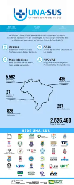 - ↑ O Brasil possui 5.570 municípios, a UNA-SUS contempla 5.563 tendo pelo menos um médico matriculado em cada município. As matriculas e ofertas podem ser encontradas em https://www.unasus.gov.br/numeros/arouca