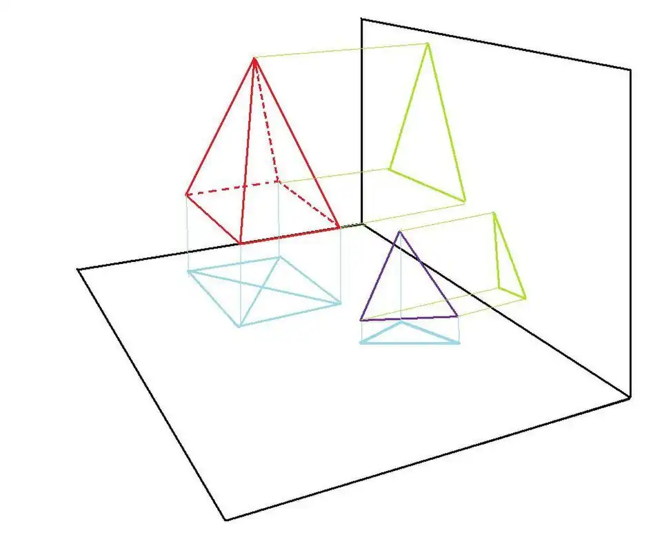 As projecções da pirâmide e o triângulo que já representámos aparecem com cores diferentes, mas como os desenhariamos com lápis na folha?
