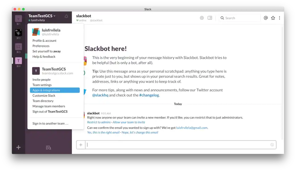 1.Clique no nome do seu time para abrir um menu, e selecione a opção "Apps & Integrations":