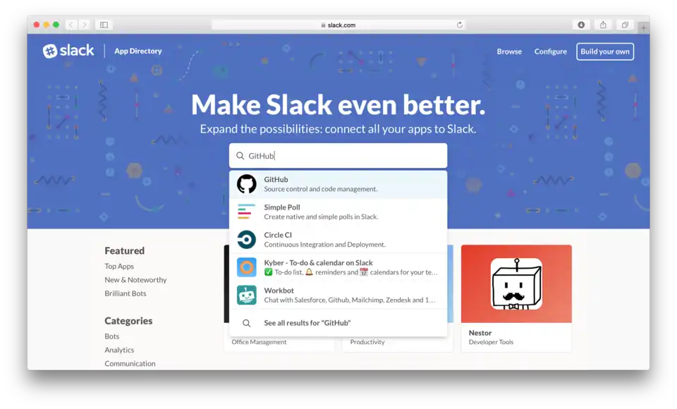 2. Você será redirecionado a uma página web onde contém todos os aplicativos e integrações disponíveis para o Slack. Procure por "GitHub"