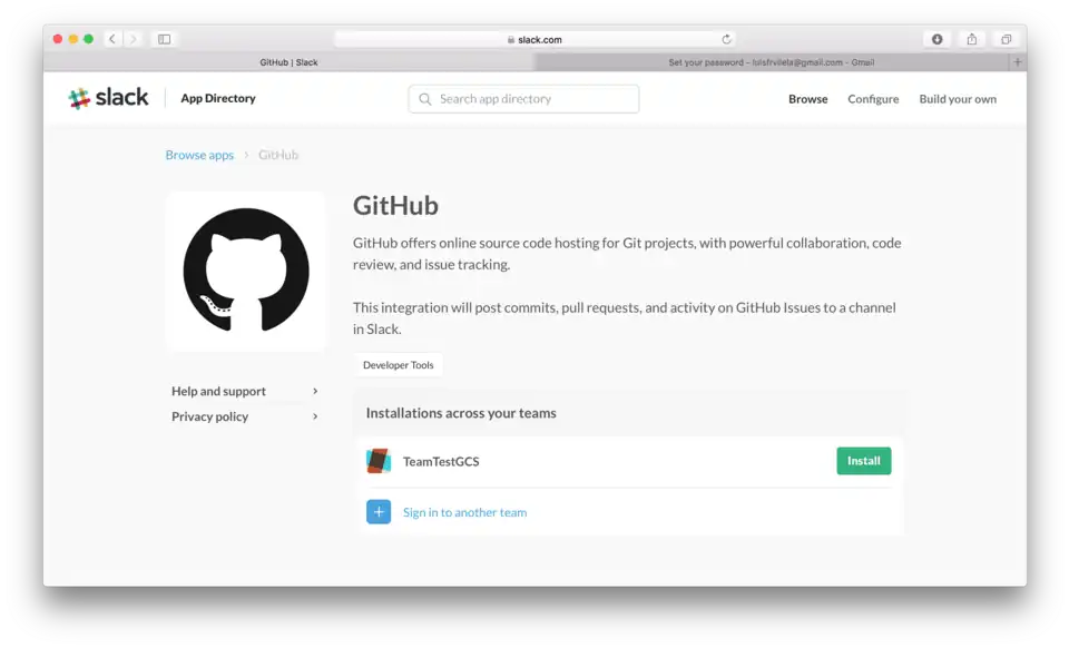 3. Ao clicar em GitHub irá abrir uma página explicando de que forma ocorre a integração, e seu time estará disponível para instalar! clique em "Install"