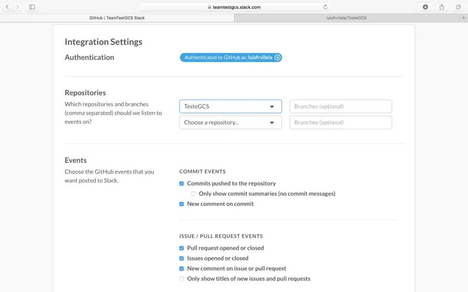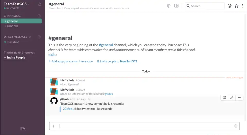 8. Terminados os passos a integração está pronta para ser usada, e as notificações ide commits e push chegam automaticamente no canal do time.