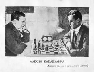 Mas foi o prodígio cubano, o diplomata José Raúl Capablanca, campeão do mundo no período compreendido entre 1921 e 1927, que colocou um fim no reinado germânico do mundo do xadrez[13]. Capablanca amava posições simples e os finais de jogo; permaneceu imbatível nos torneios por oito anos até 1924[14]. Capablanca é considerado nos dias atuais como o maior talento natural da história do enxadrismo e o maior enxadrista hispânico de todos os tempos[15]. Seu sucessor foi Alexander Alekhine, um forte atacante, que faleceu como campeão do mundo em 1946, tendo perdido seu título por um breve período de tempo para o enxadrista holandês Max Euwe em 1935, conquistando-o novamente dois anos depois[16].
