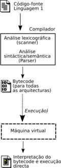 Em linguagens de programação híbridas, o compilador tem o papel de converter o código fonte em um código chamado de Bytecode (código em bytes), que é um estágio intermediário entre o código-fonte (escrito numa linguagem de programação específica) e a aplicação final.