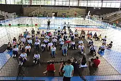 O espaço utilizado foi uma das quadras do ginásio do Sesc (Santos,SP). Nós, alunos da UNIFESP, nos separamos em cinco grupos, nos quais diferentes materiais foram utilizados para que diferentes atividades fossem aplicadas para as crianças. Os grupos utilizaram para brincadeiras: