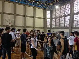 O grupo anterior tratou das concepções abertas de ensino através dos "jogos de roda", que tinha como principal objetivo desenvolver habilidades rítmicas e motoras a partir de uma visão construtivista, onde os alunos ajudaram na construção das atividades corporais. Foi perceptível a dificuldade de encontrar o ritmo por parte dos estudantes, tendo então interferência do professor em variados momentos incentivando os alunos a encontrar soluções para que a turma conseguisse chegar a um objetivo comum.